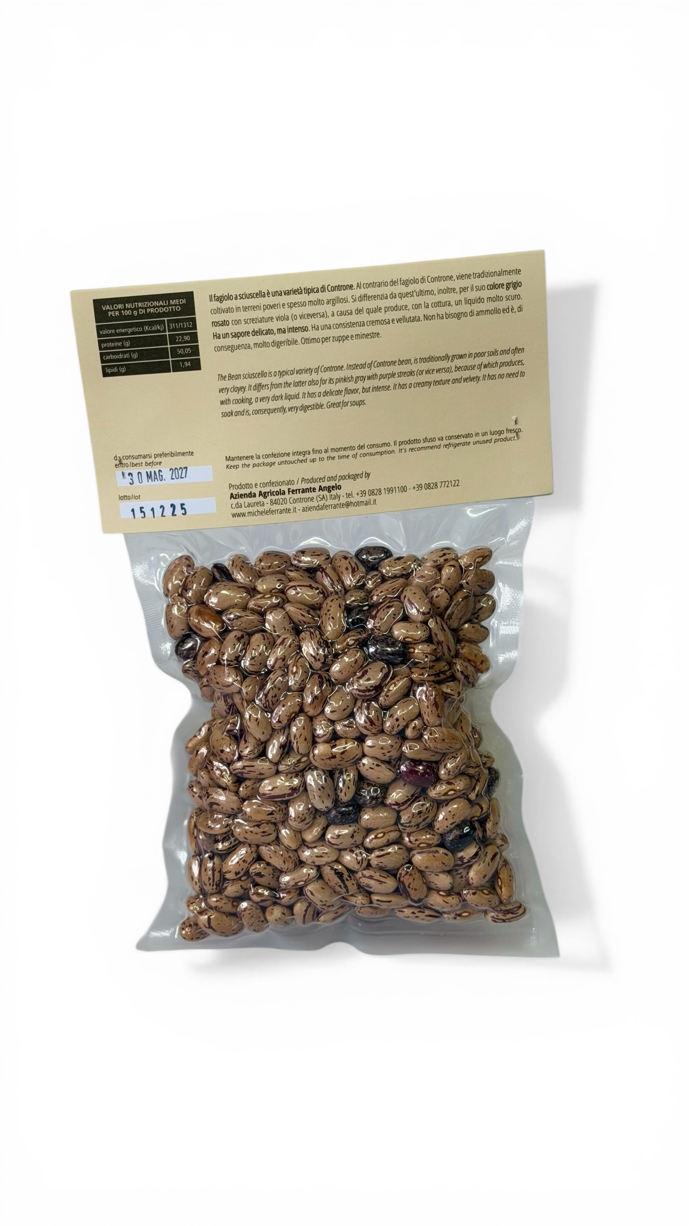Il Fagiolo Sciuscella Michele Ferrante da 300 g è un legume tipico della tradizione contadina cilentana, coltivato artigianalmente in terreni poveri e spesso molto argillosi, condizioni che contribuiscono a conferire al prodotto caratteristiche uniche e autentiche.