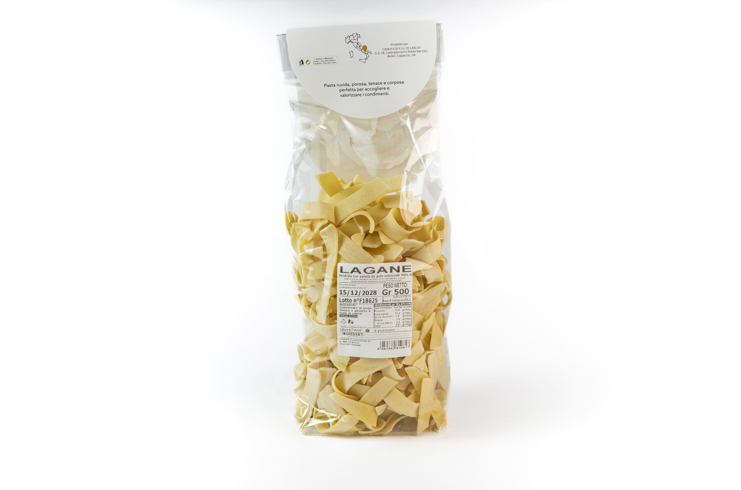 Le Lagane Cilentane sono uno dei formati più antichi della tradizione gastronomica del Cilento. Realizzate con semola di grano duro 100% italiano, sono caratterizzate dalla loro forma larga e rustica, che richiama la pasta fatta in casa delle cucine contadine.