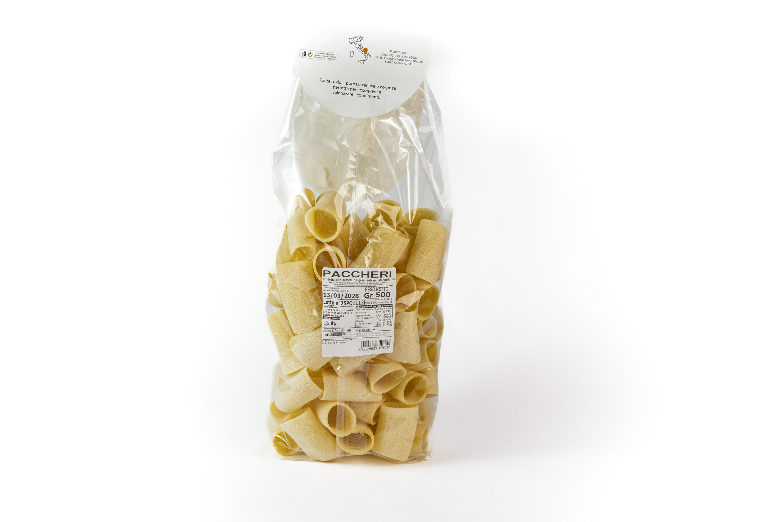 I Paccheri sono un formato di pasta generoso e ricco di carattere, tipico della tradizione del Sud Italia. Realizzati con semola di grano duro 100% italiano, si distinguono per la loro forma ampia e corposa, ideale per accogliere e valorizzare ogni tipo di condimento.